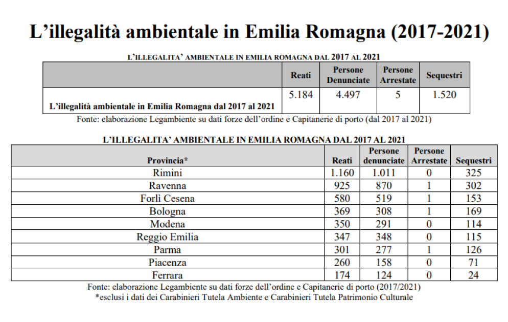 In provincia di Piacenza, dal 2017 al 2021, si sono registrati 260 reati, con 158 persone denunciate e 71 sequestri sotto la voce di illegalità ambientale. I reati contro la fauna sono stati 91 con 12 persone denunciate e 13 sequestri. Quelli del ciclo dei rifiuti sono stati 72 con 100 persone denunciate. Gli incendi dolosi sono stati 57 con sei denunce.
