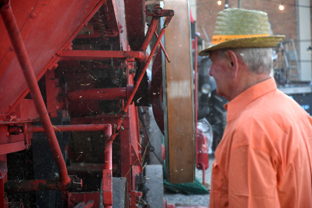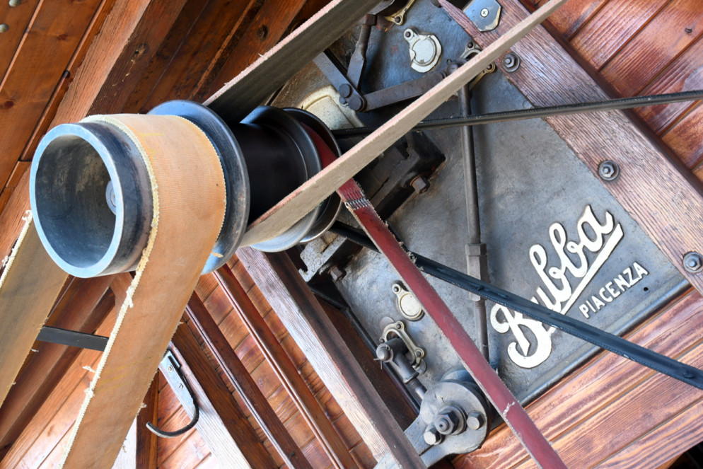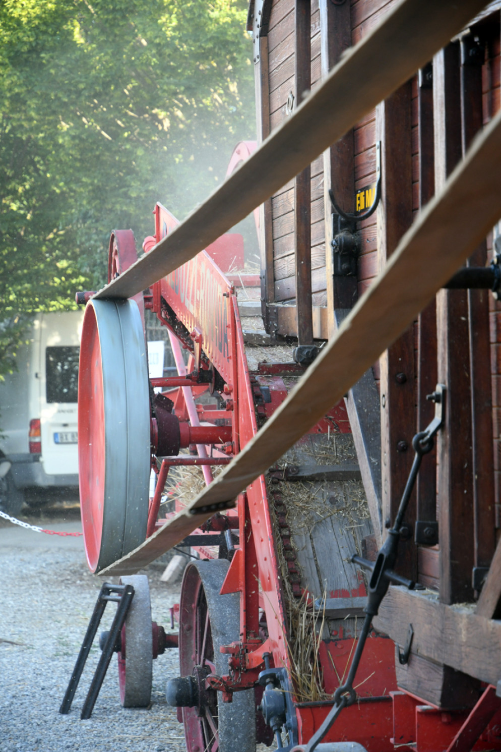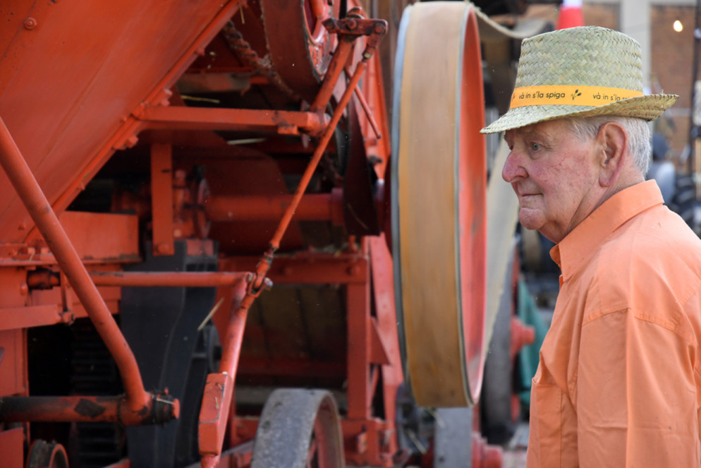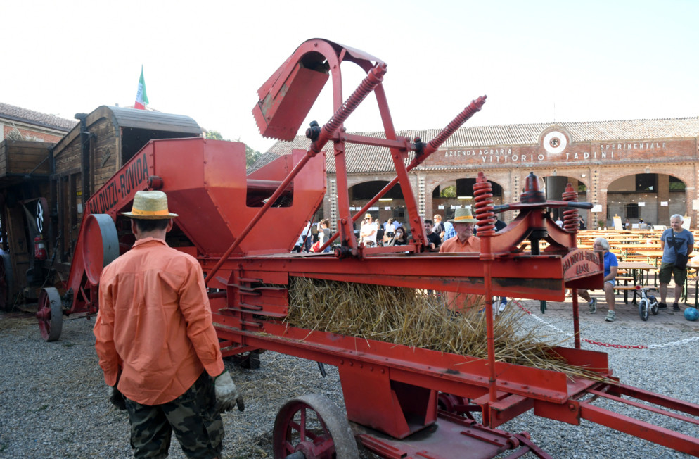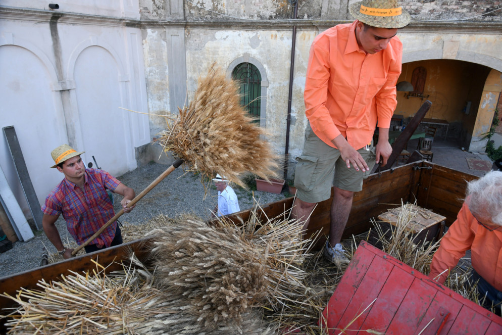 “Viene azionata con un trattore Landini tramite un “cinghione” – hanno spiegato – che fa muovere anche la pressipaglia da cui escono le balle di paglia, poi legate a mano con un filo. Sulla parte posteriore della macchina esce la granella che si metteva nei sacchi. Se il grano era maturo, lo si portava da un commerciante o nel granaio, se invece non era ancora del tutto secco, lo si portava sull’aia, come alla Faggiola, lo si faceva seccare e poi o venduto o stivato nei granai. Dalla parte anteriore esce la paglia che cade su un elevatore che va a finire nella pressipaglia”.