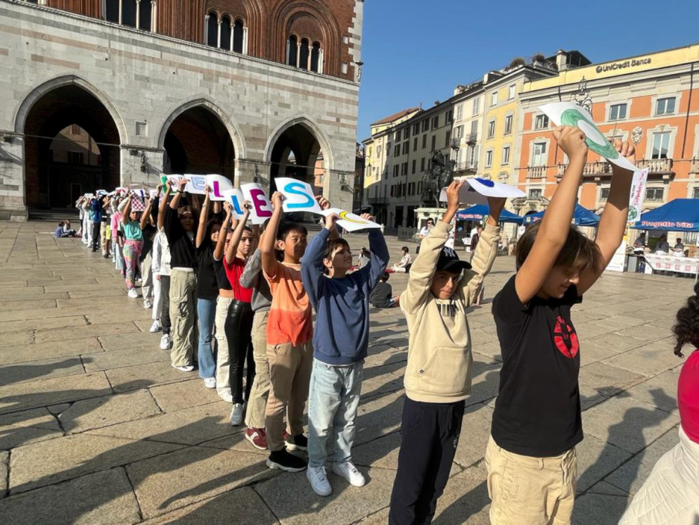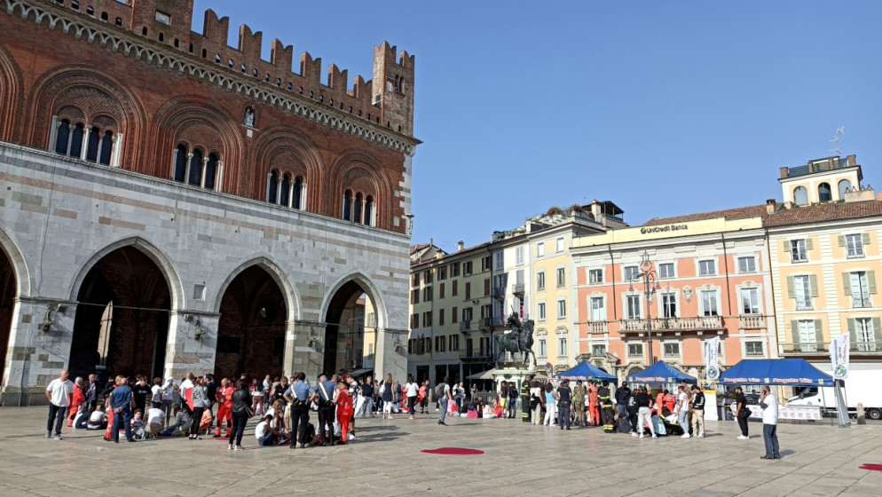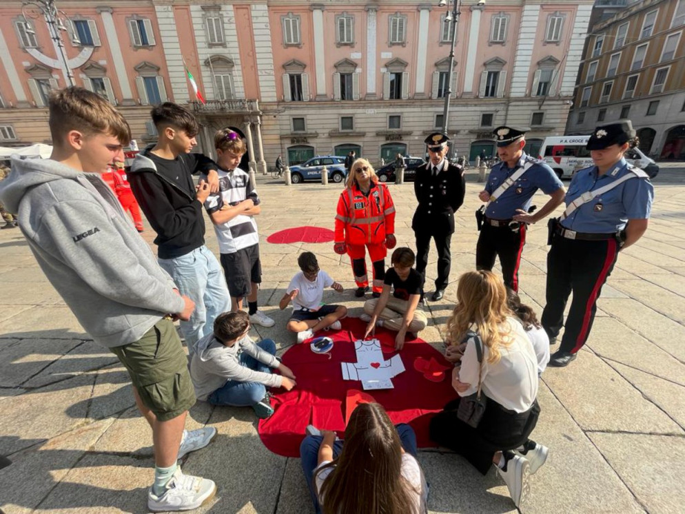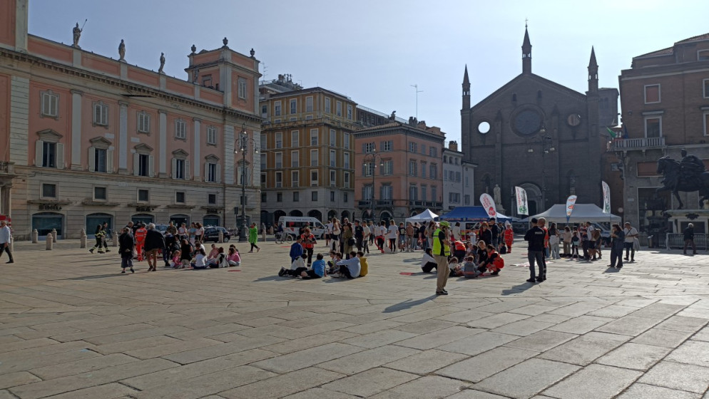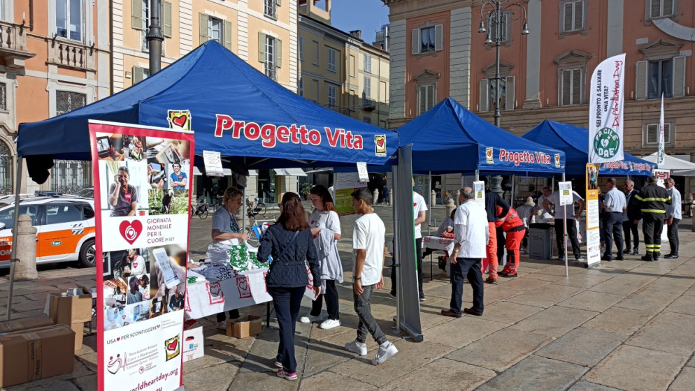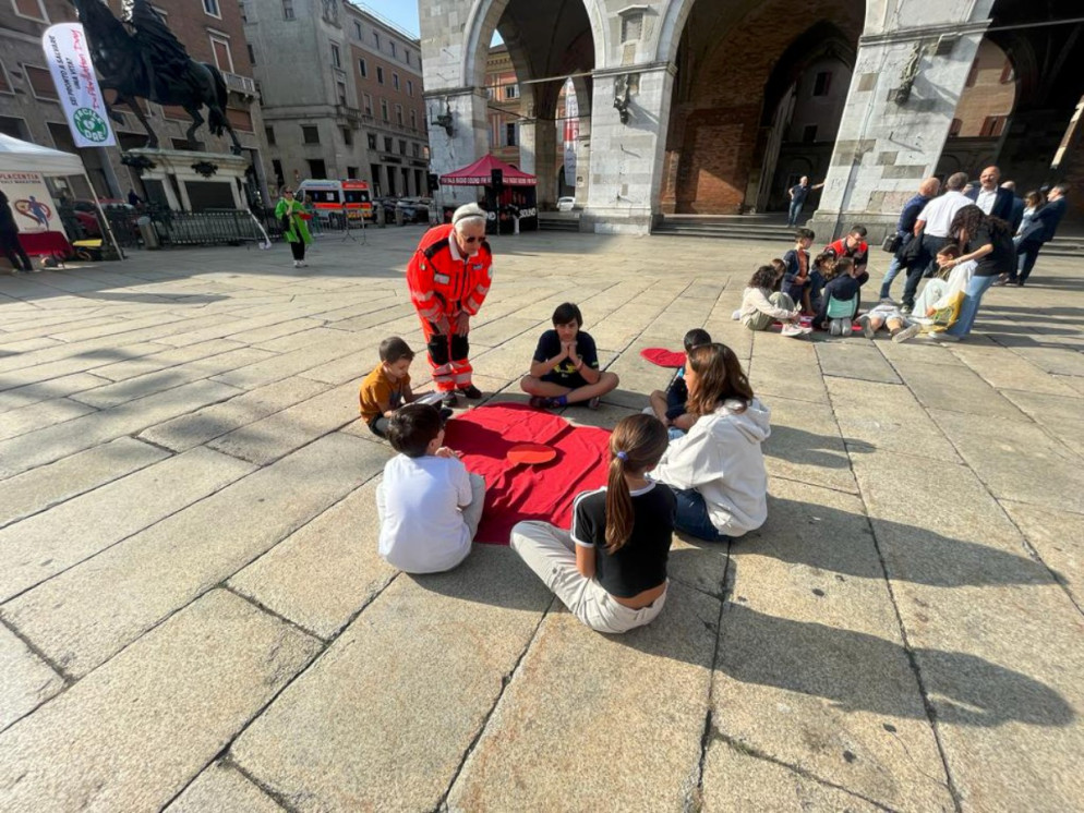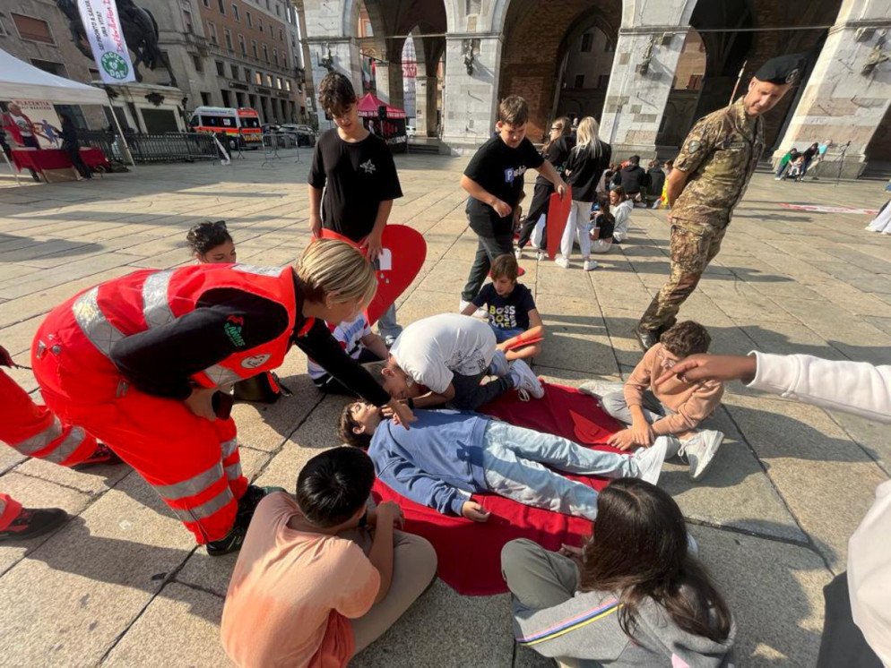 Oggi si celebra la Giornata mondiale del cuore: 150 ragazzi delle scuole di Piacenza si sono ritrovati in piazza Cavalli per imparare a usare il defibrillatore.