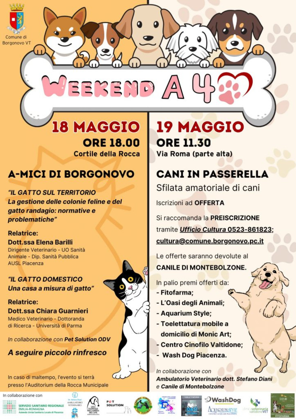 Questo fine settimana Borgonovo diventa capitale degli amici a 4 zampe. Sabato 18 maggio, a partire dalle 18, protagonisti saranno i felini, al centro di due incontri nel cortile della rocca con esperte veterinarie. I temi trattati saranno le colonie feline e gli ambienti domestici a misura di gatto. Domenica protagonisti saranno invece i cani con una sfilata a 4 zampe lungo via Roma. Il ricavato verrà destinato al canile di Montebolzone.