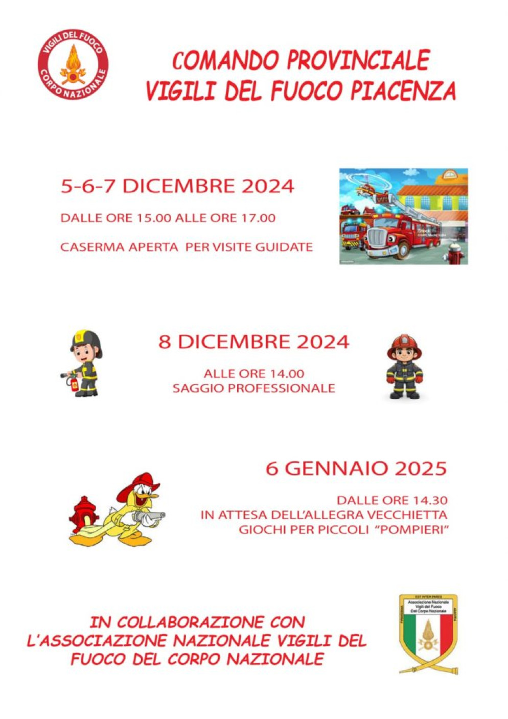 Nell’anno nuovo, la sede centrale del Comando Vigili del Fuoco di Piacenza sarà inoltre visitata dall’ “allegra vecchietta”. Il 6 gennaio la Befana saluterà i bambini presenti, che nell’attesa saranno coinvolti in attività e giochi che li faranno diventare per qualche ora dei piccoli vigili del fuoco.