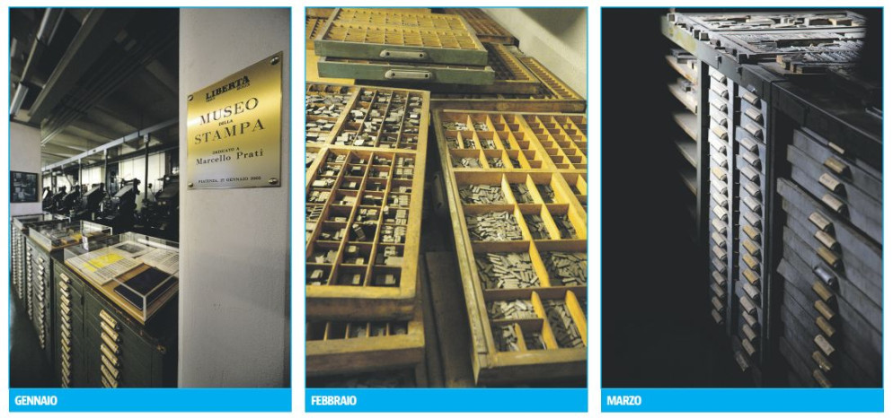 Gli scatti di Maurizio Cavalloni delineano un percorso nel tempo e nello spazio: ad aprire il calendario, in gennaio, è uno sguardo sul Museo, con la targa dorata in cui si ricorda Marcello Prati, che con il fratello Ernesto rifondò il giornale nel dopoguerra.