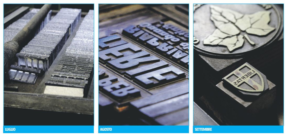 A luglio e agosto ecco i caratteri in legno, ottone e piombo: di diverse dimensioni e altezze, per comporre testi e titoli. Settembre mette in mostra i cliché, che servivano a stampare le immagini: quelli fotografati raccontano di partiti ormai spariti.