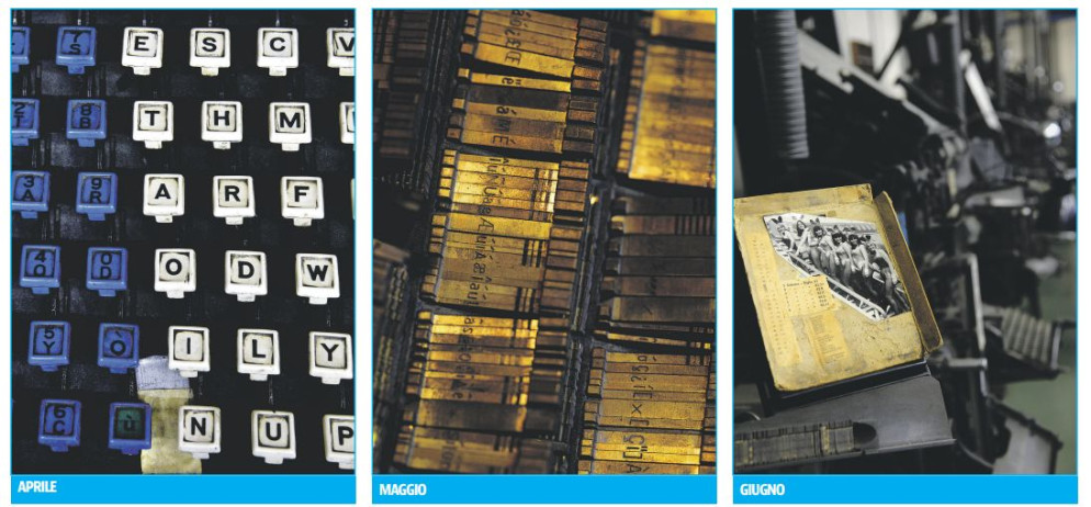 I mesi di febbraio e marzo mostrano le cassettiere con i caratteri che servivano a realizzare le pagine, mentre ad aprile ecco le tastiere di composizione delle macchine e a maggio i tasti che si alzavano e abbassavano.