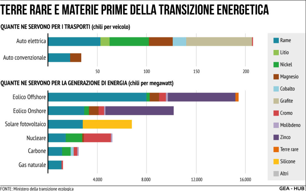 “Ad esempio – spiega il Mite – una vettura elettrica utilizza un quantitativo di materie prime di circa 6 volte quello di un’auto alimentata a combustibili fossili. Anche nel caso di un impianto eolico on-shore il quantitativo di materie prime è circa nove volte quello che si sarebbe utilizzato per la costruzione di un equivalente impianto alimentato a gas”.