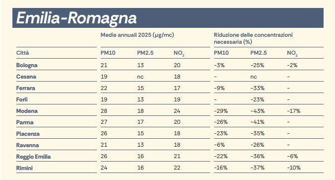 La maglia nera quest'anno va a Palermo, con 89 giorni oltre il limite, seguita da Milano con 66 sforamenti, e Napoli con 64. Piacenza nel 2025 si colloca tra i 55 capoluoghi con la concentrazione media annuale di PM10 più alta in Italia con a una media giornaliera di 26 microgrammi per metrocubo; in Emilia Romagna è preceduta da Modena (28) e Parma (27). Se ci proiettassimo al 2030, ovvero fra quattro anni, con i nuovi limiti europei in vigore, nella nostra città sarebbe necessario ridurre gli inquinanti del 23%.