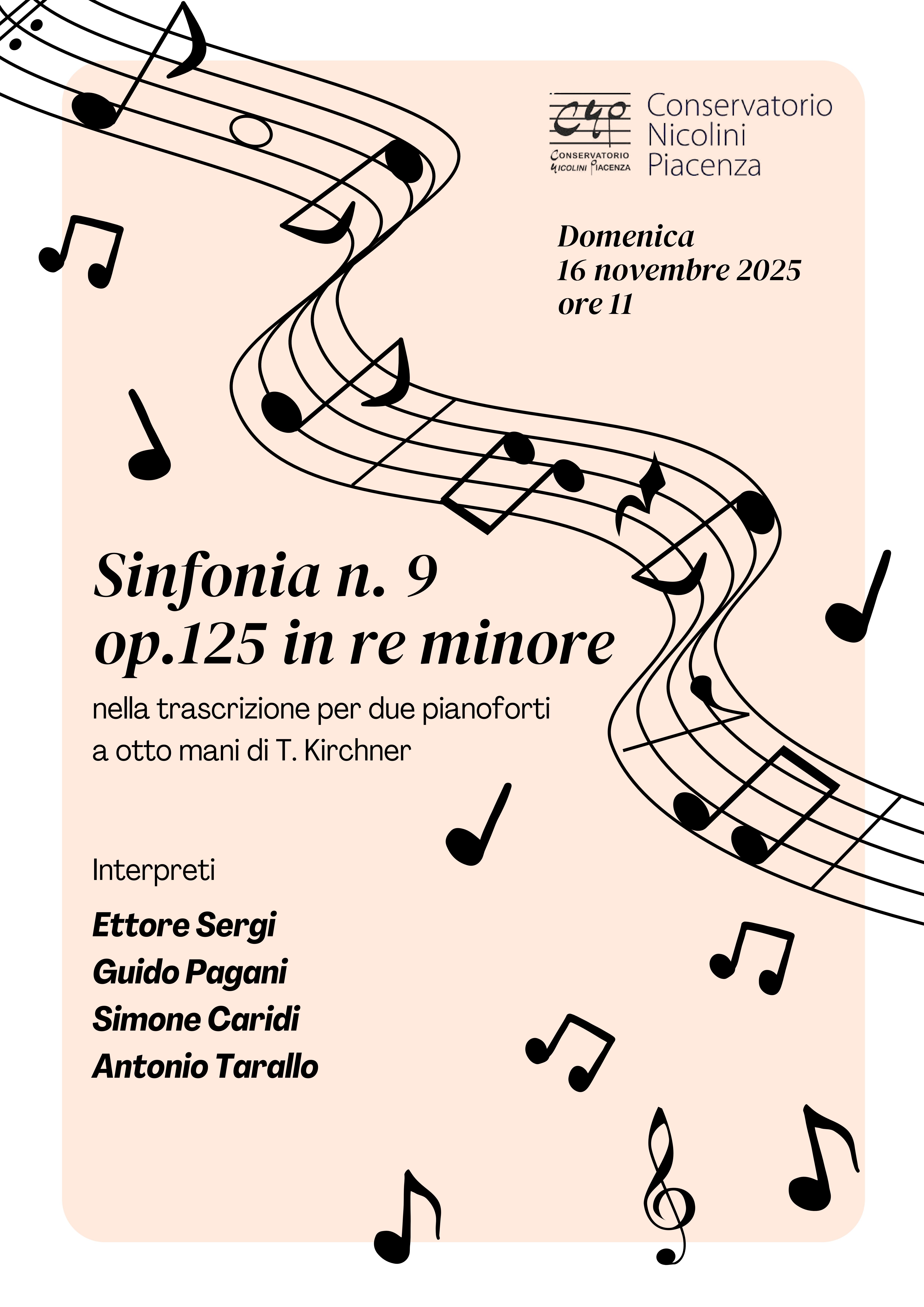 Domenica 16 novembre alle ore 11 il Conservatorio Nicolini ospita un appuntamento di particolare interesse per il pubblico amante della musica classica. In programma la Sinfonia n. 9 in re minore op. 125 di Ludwig van Beethoven, proposta nella trascrizione per due pianoforti a otto mani realizzata da Theodor Kirchner.