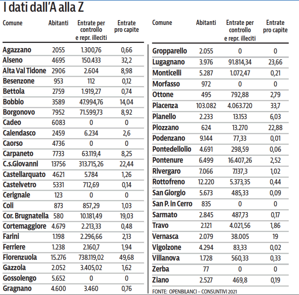 Sopra questa soglia ci sono anche alcuni comuni del Piacentino: ad esempio quello di Fiorenzuola che nel 2021 ha incassato 313.715 euro ed è in testa su base provinciale con 49,7 euro per ogni abitante, oltre tre volte la media nazionale. Segue il comune capoluogo, Piacenza, con 39,7 euro pro capite a fronte di un incasso di 4.063.720 euro; sul terzo gradino del podio, un po’ a sorpresa, gli abitanti di Alseno (comune che ha incassato 150.433 euro) con 32,2 euro a testa. Al quarto posto gli abitanti di Castel San Giovanni con 22,4 euro pro capite a fronte di un incasso complessivo di 313.715 euro; poi i bobbiesi con 14 euro a testa (incasso totale 47.994 euro).