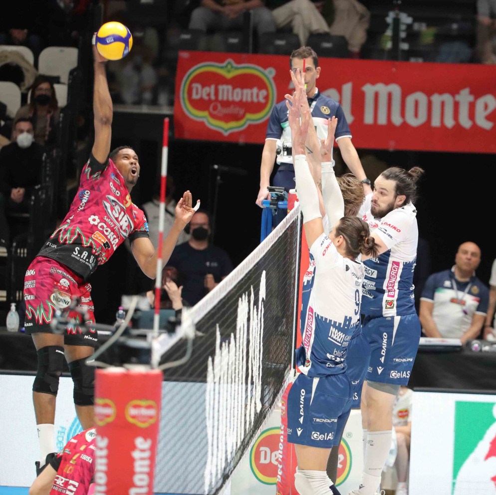 Quella vista all’Unipol Arena di Casalecchio di Reno (Bologna) è probabilmente la miglior Gas Sales Bluenergy della stagione. Una squadra che suda, lotta e regala sprazzi di grande pallavolo. Purtroppo però non basta ancora per battere la squadra che al momento rimane la più forte del massimo campionato italiano (e probabilmente del mondo): la Sir Safety Perugia che, trascinata da un Leon a dir poco fenomenale, si aggiudica la semifinale di Coppa Italia con il punteggio di 3-1 staccando il pass per la finalissima di domani (affronterà Trento, che nell’altra semifinale ha “schiantato” Milano 3-0).