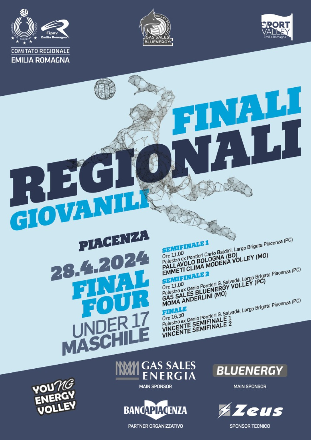 La programmazione prevede che alle 11.00 alla Palestra Salvadè (ex Pontieri) la Gas Sales Bluenergy affronterà il Moma Anderlini Modena mentre l’altra semifinale, che si giocherà alla Palestra Carlo Baldini (ex Pontieri) sempre alle ore 11.00, vedrà affrontarsi Pallavolo Bologna ed Emmeti Clima Modena Volley.