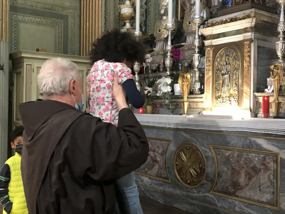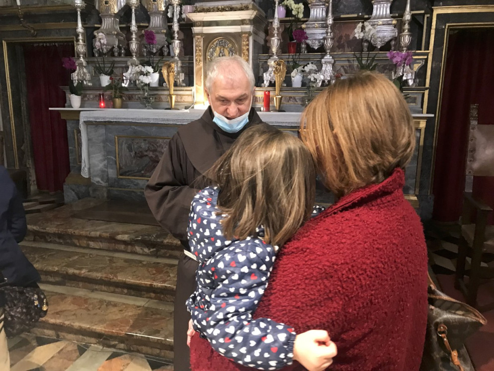 Eleonora arriva con i figli vicino all’altare: ad accoglierli è padre Secondo Ballati, il padre guardiano. È lui a portare i bambini davanti alla statua della Madonna, a far fare loro il segno della croce, una preghiera e poi il ballo. Li solleva verso la statua e li rimette giù. “Lo scorso anno facevamo le benedizioni a distanza – spiega – anche adesso, ma i bambini sono così simpatici che a volte ci dimentichiamo e li prendiamo in braccio”.