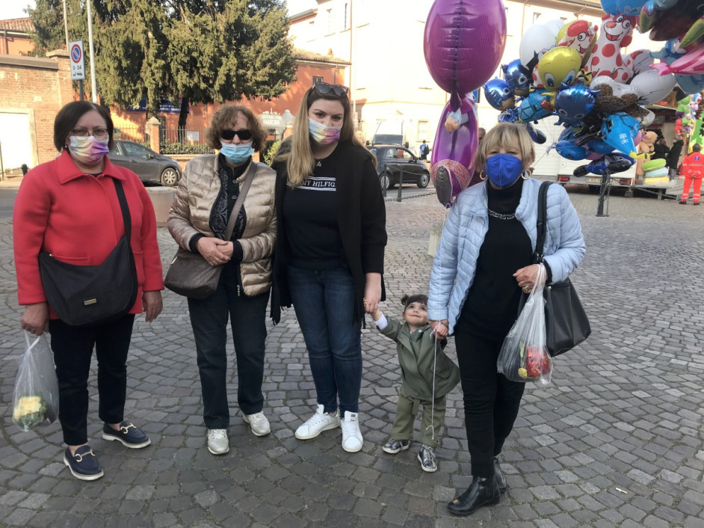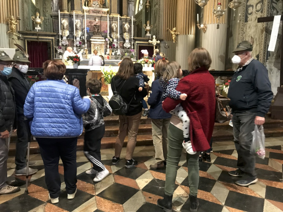 Sorride Anna Olivia con i codini e il vasetto di primule gialle in mano che le hanno consegnato gli alpini dopo la benedizione davanti alla statua della Madonna. Padre Franco l’ha sollevata in alto come ha fatto con altri bambini: è questo il ballo secolare che ogni 25 marzo si ripete puntuale nella basilica di Santa Maria di Campagna. Sono circa trecento i bimbi che quest’anno sono stati benedetti dai frati della basilica: pochi rispetto agli anni d’oro pre-pandemia quando in un pomeriggio si arrivava anche a 600 o 700 bambini. Ma il covid ha inciso anche qui: lo scorso anno la tradizione è stata rispettata seppure in forma molto ridotta, quest’anno molti piacentini non hanno voluto mancare.