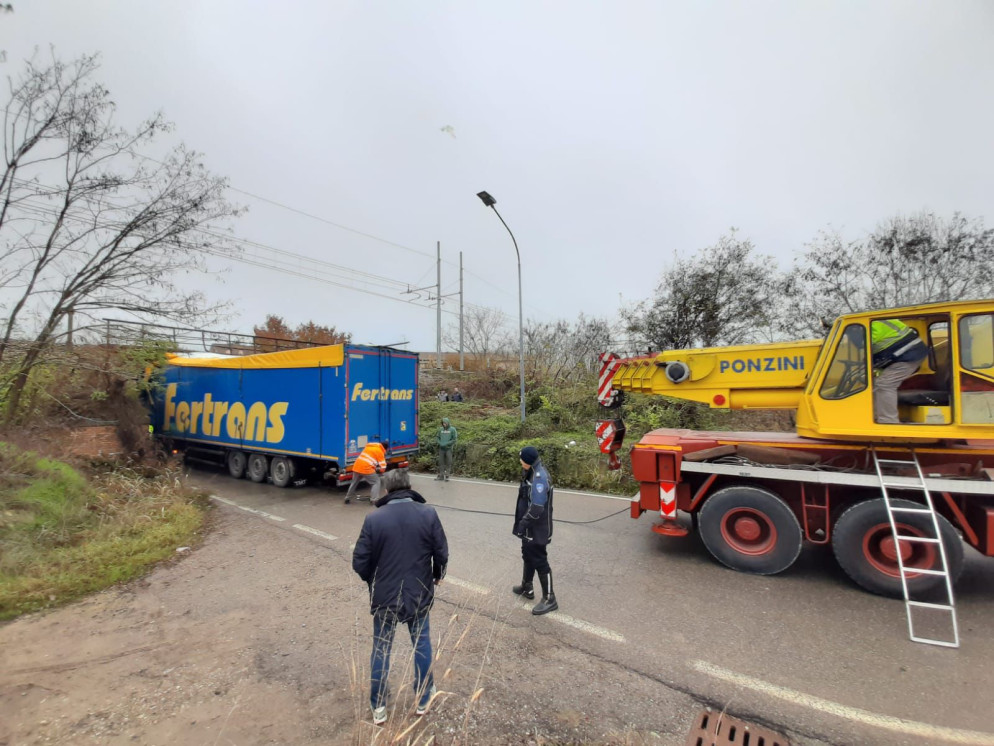 Camion incastrato nel sottopasso di Caorso. La strada resta chiusa
