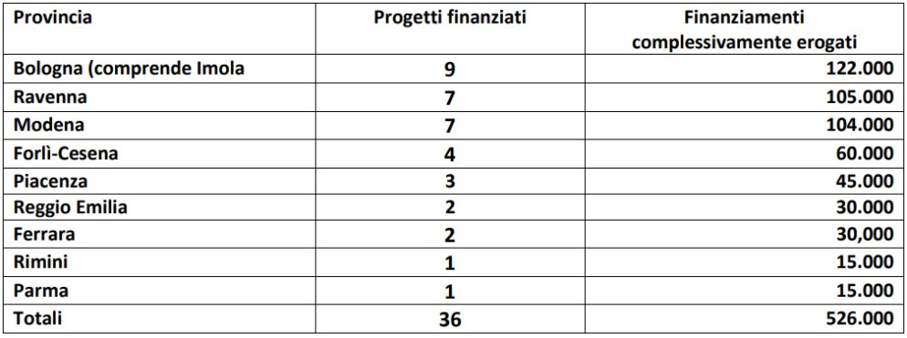 Tutte le province dell’Emilia-Romagna sono interessate da almeno un progetto. La liquidazione del finanziamento avverrà in due step: la prima tranche – pari al 10 per cento delle spese ammesse a contributo – sulla base della documentazione che attesti l’avvio dell’iniziativa, il secondo bonifico in fase di conclusione.