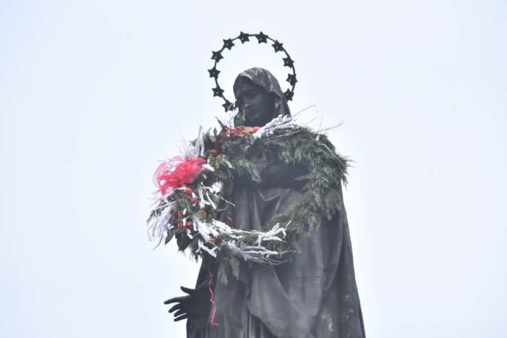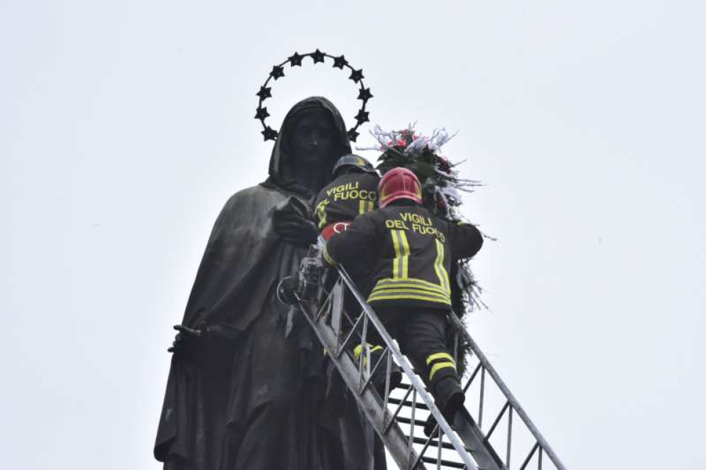 Piazza Duomo improvvisamente affollata, al termine della messa in Cattedrale, per la tradizionale posa della corona di fiori alla statua dell’Immacolata Concezione situata sulla colonna al centro della piazza, ad opera dei vigili del fuoco.