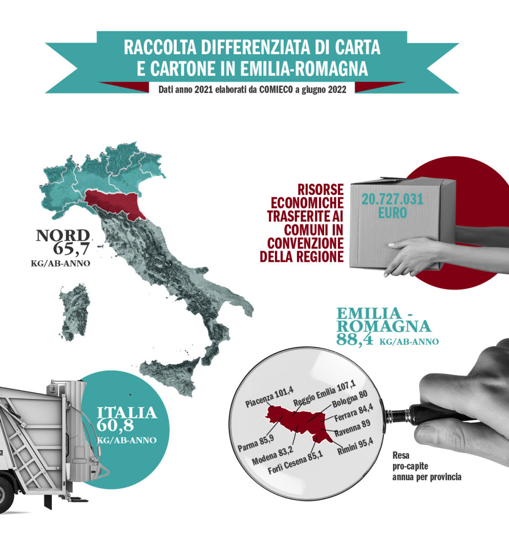 “L’Emilia Romagna anche nel 2021 ha dato prova di essere una delle regioni più virtuose d’Italia” dichiara Carlo Montalbetti, Direttore Generale di Comieco “la raccolta è cresciuta di quasi 21.000 tonnellate rispetto al 2020 e la media pro-capite è la più alta in Italia (88,4 kg/ab-anno). Nonostante questo, i margini di crescita ci sono ancora sia per quanto riguarda il livello di intercettazione della frazione cellulosica sul totale dei rifiuti prodotti, pari al 13,6%, che per la qualità della raccolta”.