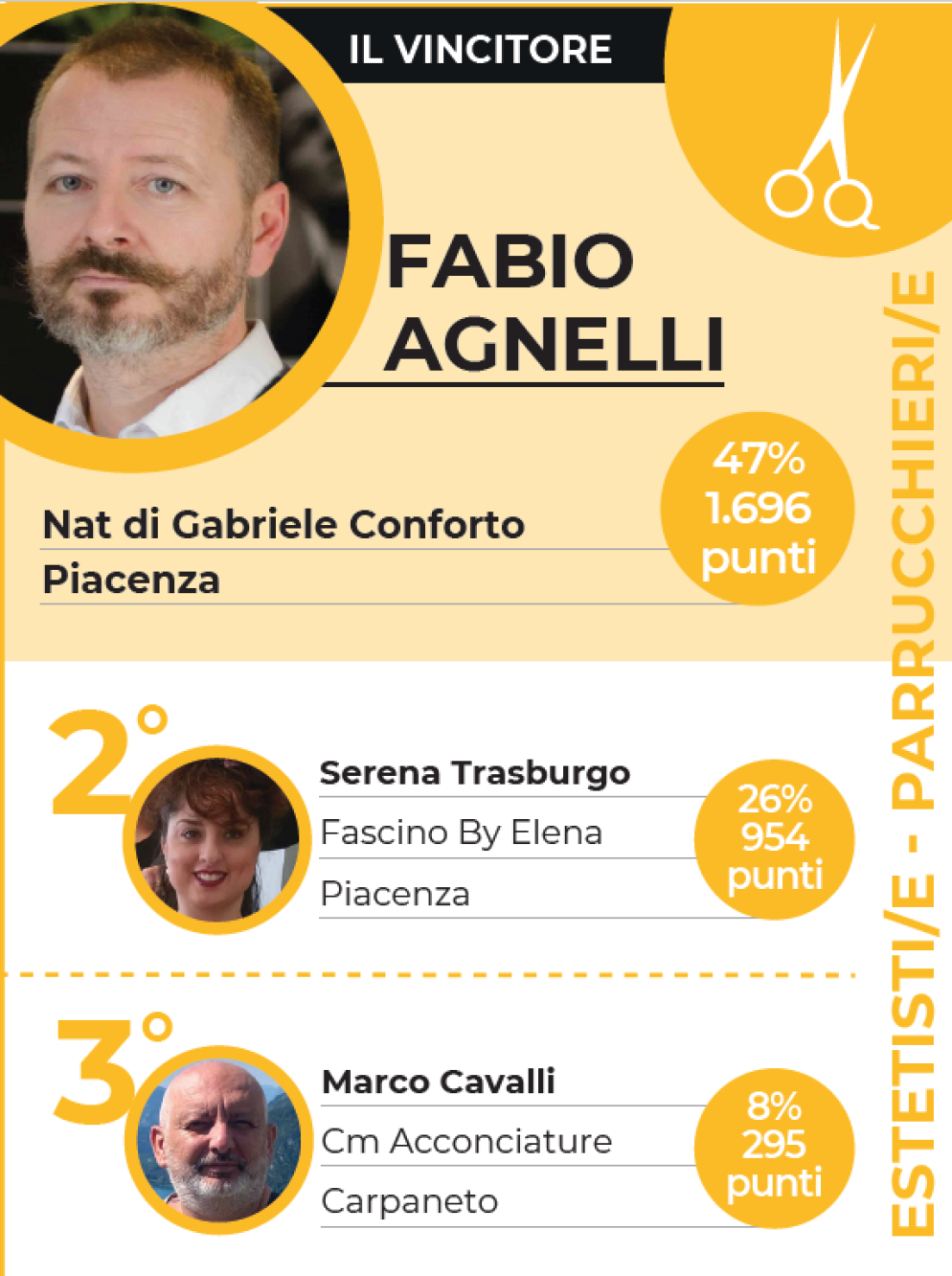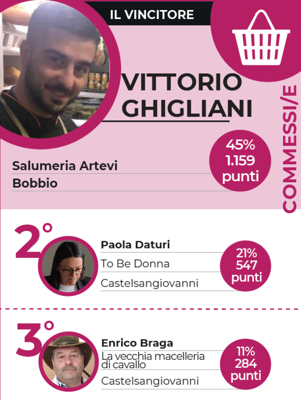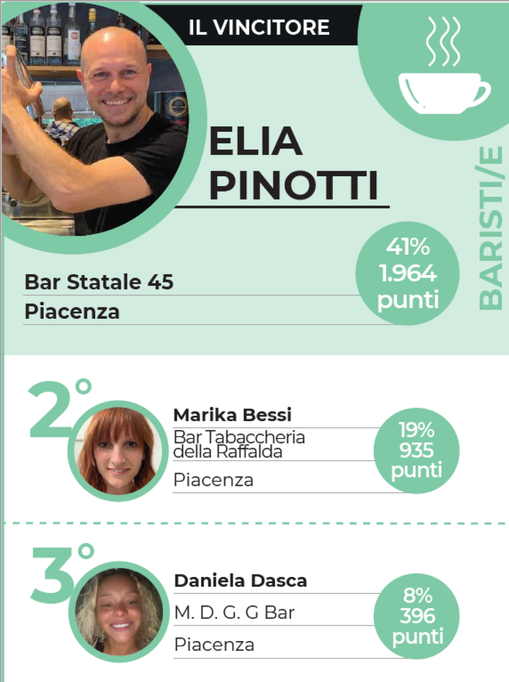 Nella categoria baristi, l’ha spuntata Elia Pinotti del Bar Statale 45 con 1.964 punti, davanti a Marika Bessi del Bar Tabaccheria della Raffalda e a Daniela Dasca del G-Bar. Tra i commessi, primo posto per Vittorio Ghigliani della Salumeria Artevi di Bobbio con 1.159 punti, seconda Paola Daturi di To Be Donna di Castel San Giovanni, terzo Enrico Braga della Vecchia Macelleria di Cavallo di Castel San Giovanni. Infine, nella categoria parrucchieri, trionfo per Fabio Agnelli di Nat di Gabriele Conforto con 1.696 punti, secondo posto per Serena Trasburgo di Fascino by Elena e terzo per Marco Cavalli di CM Acconciature di Carpaneto.