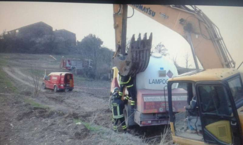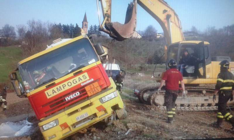Gpl bruciato, autocisterna raddrizzata con un grosso escavatore. Le foto