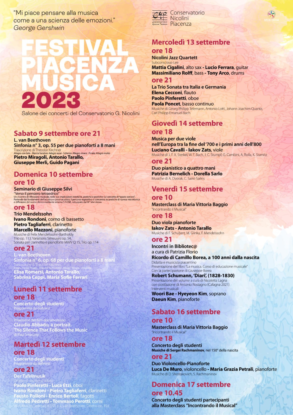 Torna il Festival Piacenza Musica targato conservatorio Nicolini. Sabato 9 settembre alle 21, con l’esecuzione della Sinfonia n.3 op.55 di Beethoven nella trascrizione per due pianoforti a otto mani, viene inaugurata la quarta edizione della manifestazione musicale che vede alternarsi, sul palco del Salone, una ventina di appuntamenti tra concerti, seminari, masterclass, presentazioni di libri e proiezioni che si terranno dal 9 al 17 settembre.